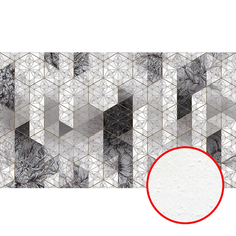 Фреска включает в себя флизелиновую основу с геометрическими узорами и цветами в цветах белый, серый и черный.