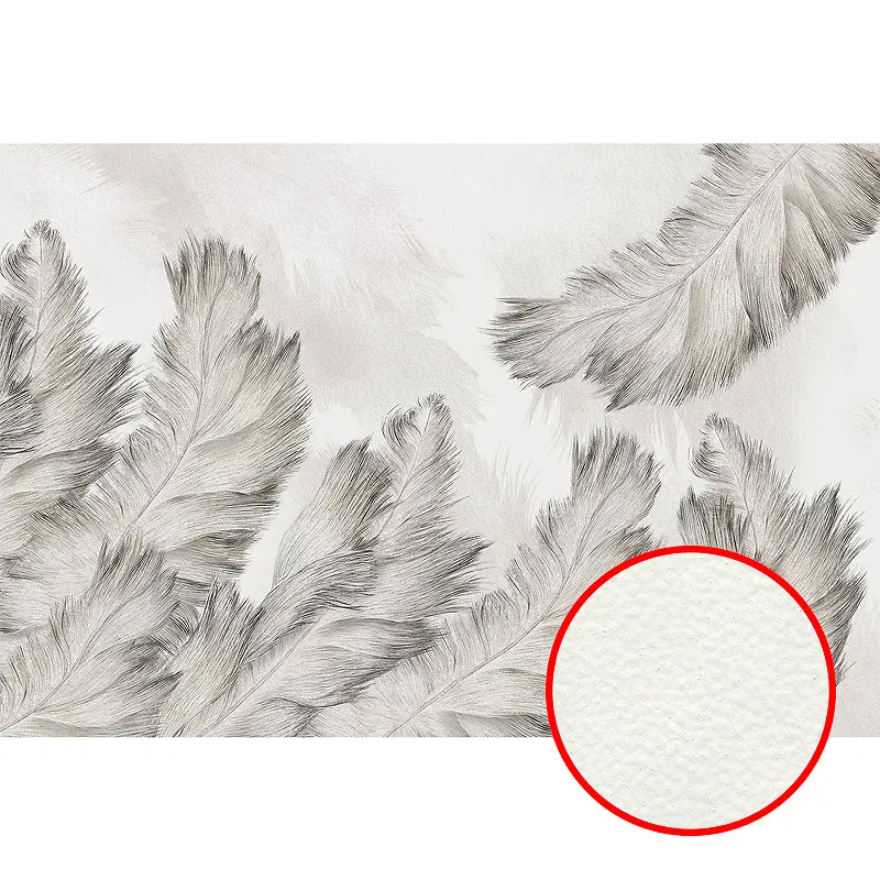 - Универсальность использования: Фреска подходит для любого интерьера благодаря нейтральному серому цвету и рисунку с перьями.