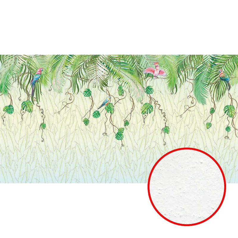 - Флизелиновая фреска (5 м x 2,7 м) с рисунком "Листья, птицы" в зеленом и бежевом цветах.