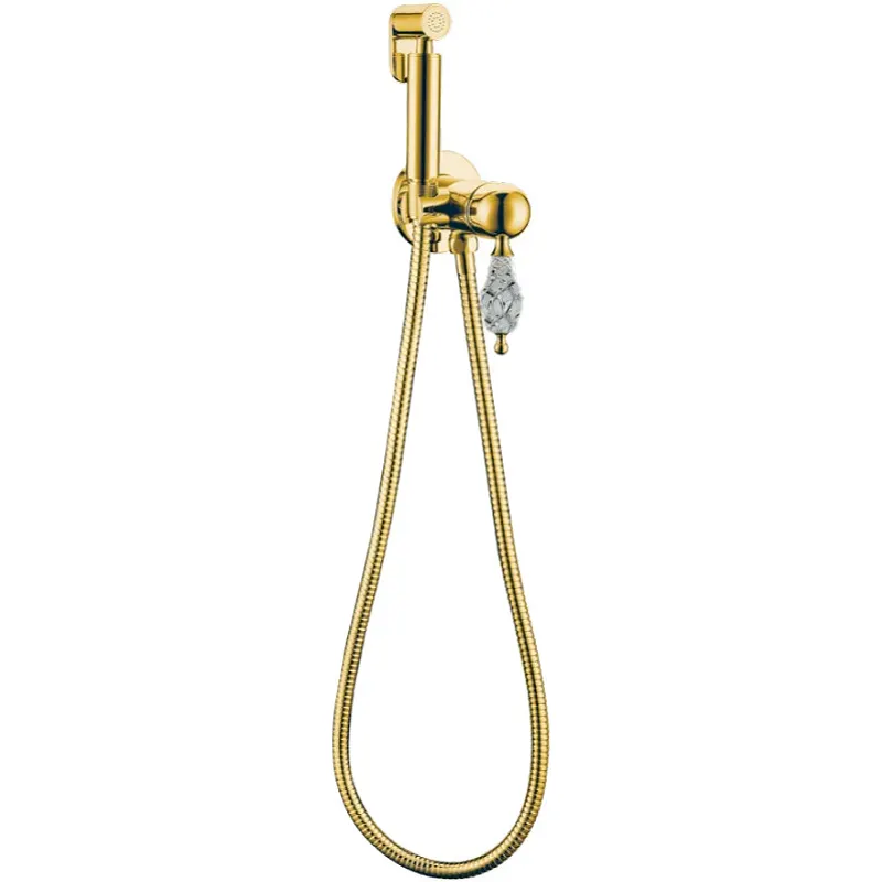 Гигиенический душ со смесителем Boheme Imperiale 435-CRST.Характеристики: Цвет: золото. Материал: латунь. Ручка: кристалл. Механизм: керамический картридж. Управление: однорычажное. Лейка гигиенического душа с нажимным механизмом. Гигиенический душ с одним режимом. Стандарт подводки: G 1/2. Монтаж: встраиваемый. В комплекте поставки: Смеситель (внешняя и внутренняя часть). Гигиенический душ. Душевой шланг.