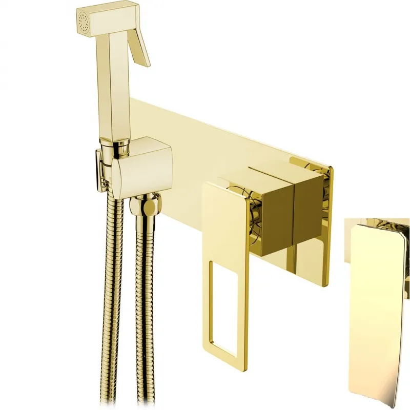 Гигиенический душ со смесителем Boheme Q 147-GG.2.Цвет: золото. Материал: латунь. Механизм: керамический картридж. Управление: однорычажное. Стандарт подводки: G 1/2. Гигиенический душ с одним режимом. Монтаж: на стену (скрытый).В комплекте поставки:смеситель; гигиенический душ; душевой шланг; внутренняя часть.