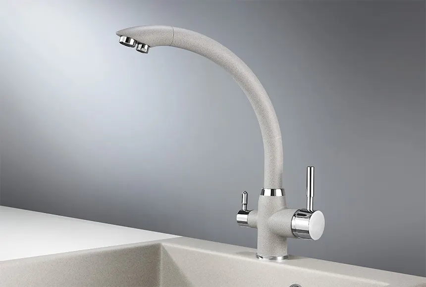 - Функциональность: Двухрычажная модель оснащена краном для питьевой воды, что обеспечивает доступ к фильтрованной воде.