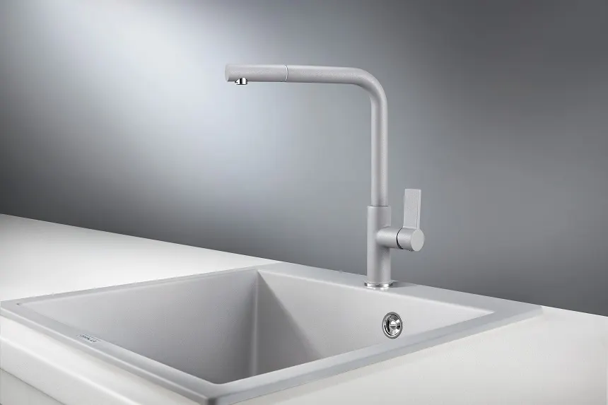 - Современный дизайн: Однорычажная модель смесителя обеспечивает легкость управления и добавляет кухне современный вид.