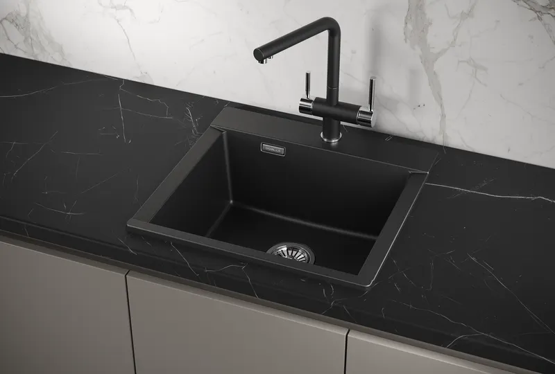 - Кварцевая кухонная мойка: Материал гарантирует устойчивость к царапинам и воздействию высоких температур.