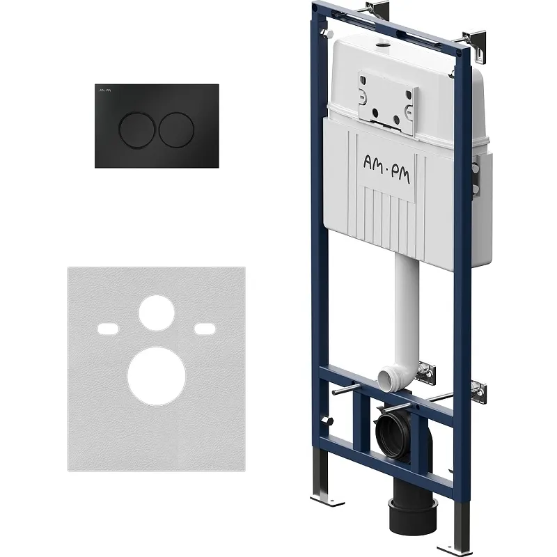 Инсталляция AM.PM MasterFit I012710.0138 для подвесного унитаза с Черной матовой клавишей смыва.Характеристики: Цвет рамы: синий. Материал: нержавеющая сталь, ABS-пластик. Тип инсталляции: для подвесного унитаза. Размеры (ШхВхГ): 530х1240х200 мм. Монтажная высота: 1045-1240 мм. Монтажная глубина: 150-200 мм. Давление смыва: 0.02 - 1.05 МПа. Межосевое расстояние под крепежные шпильки:180-230 мм. Объем смыва: 3/6 л. Объем смывного бачка: 9 л. Подвод воды: сзади сверху. Угловой запорный вентиль 1/2. Максимальная нагрузка: до 400 кг. Шумоизоляция. Заливной клапан с низким уровнем шума - Класс II, согласно европейского стандарта EN 14124. Установка: в капитальную стену и в пол. Клавиша смыва: Цвет: черный матовый. Материал: ABS-пластик. Размеры (ШхВхГ): 220х150х10 мм. Режим слива воды: две кнопки (режим эконом). Управление: механическое. В комплекте поставки: Инсталляция: монтажная рама; арматура; бачок с системой смыва; монтажная коробка; крепежные шпильки; крепление для унитаза; система смыва; элементы крепления к стене; патрубки для подключения к унитазу; звукоизолирующая прокладка. Клавиша смыва. Набор креплений. Инструкция.