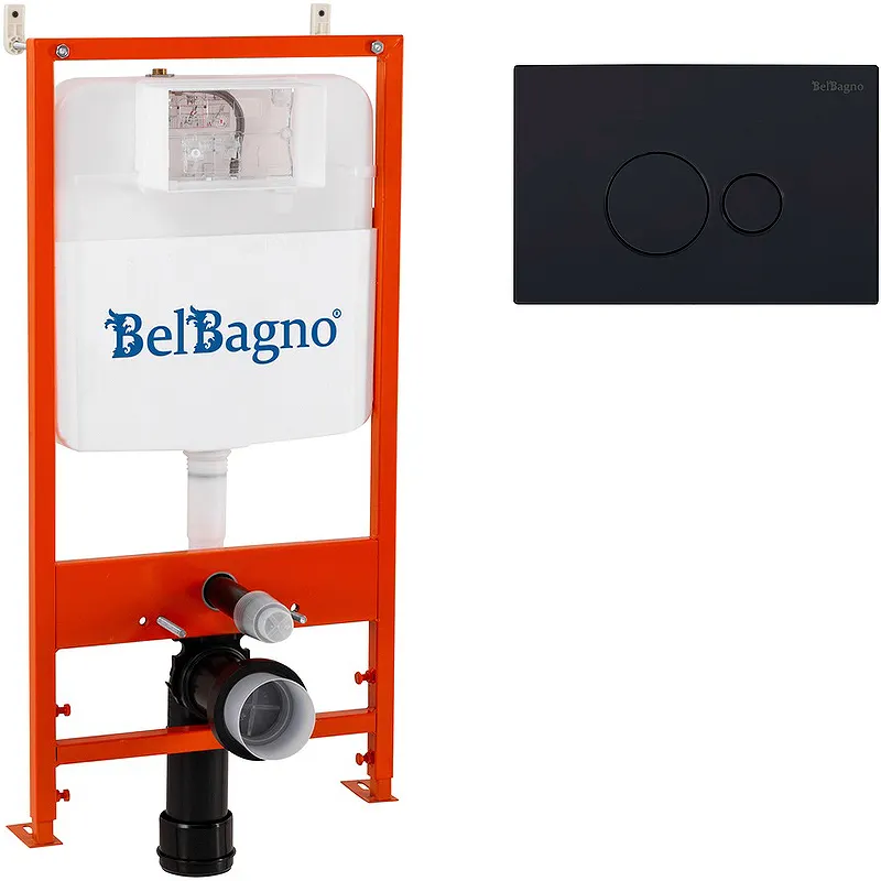 Инсталляция BelBagno BB026/BB084NERO с Черной матовой клавишей смыва.Характеристики:Инсталляция: Цвет: оранжевый. Материал: сталь, пластик. Рама из профильной трубы по всему периметру. Габариты (ШхВхГ): 548х1300х295 мм. Монтажная глубина: 140 мм. Монтажная высота: 1070 мм. Регулируется по высоте: от 0 до 230 мм. Диаметр трубы от бачка: 45 мм. Диаметр переходника для слива: 90 на 110 мм. Диаметр слива: 90 мм. Объем бачка: 6 л. Объем смыва: 3/6 л. Тепло-, шумоизоляция бачка. Метод крепления: в капитальную стену и пол. Подвод воды: сверху бачка. Межосевое расстояние под крепежные шпильки (для подвесных унитазов): 180 мм. Регулируемое межосевое расстояние под крепежные шпильки: 180/230 мм. Рекомендуемая нагрузка: до 400 кг. Монтаж: крепление к стене и к полу (6 точек крепления). Клавиша смыва: Цвет: черный матовый. Материал: ABS-пластик. Размеры (ШхВхГ): 260х167х14 мм. Режим слива воды: две кнопки (режим эконом). Управление: механическое. Открывание и закрывание с системой Click. Высокая устойчивость к царапинам. В комплекте поставки: Инсталляция. Крепежные элементы для унитаза. Крепежные элементы для рамы. Комплект соединительных патрубков для унитаза. Фановый отвод для слива. G1/2 запорный клапан. Клавиша смыва.