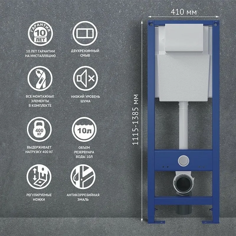 Инсталляция Berges Wasserhaus Atom 410 040332 для унитаза.Характеристики: Инсталляция : Материал: латунь, полипропилен Габариты (ШхВхГ): 41х138,5х27,5 см. С регулировкой по высоте. Расчетная нагрузка: 400 кг. Стальная рама с антикоррозийным покрытием. Межосевое расстояние под крепежные шпильки унитаза: 18 и 23 см. Бачок с функцией шумоподавления. Эконом слив: 3л. Полный слив: от 5,5 до 8,5л. Монтаж: к стене. Направление выпуска: горизонтальное. Стандарт подключения воды: G 1/2. Клавиша смыва Soft Touch: Цвет клавиши: черный. Форма кнопок: прямоугольная. Габариты (ШхВхД): 24,7x16,5х1,8 см. Материал: пластик. Управление: механическое. Количество режимов смыва: 2. В комплекте поставки: Инсталляция. Смывной бачок. Шумоизолирующая прокладка. Кнопка смыва. Комплект установки.