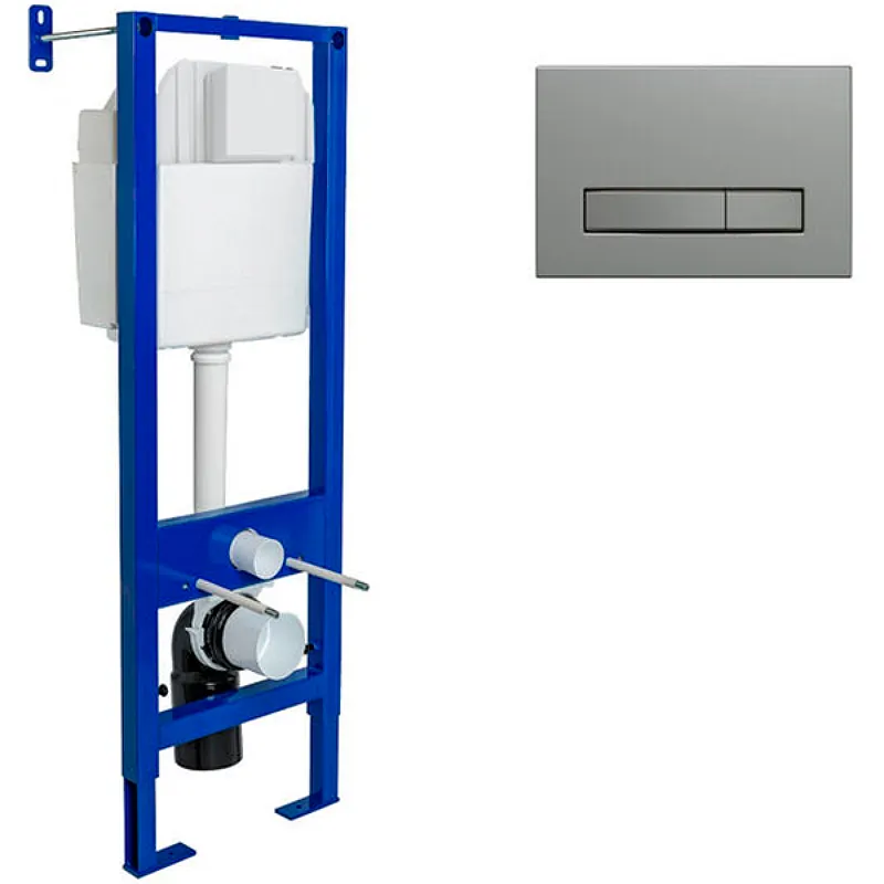 Инсталляция Berges Atom 410 040345 для унитаза.Характеристики:Инсталляция: Материал: латунь, полипропилен. Узкая рама шириной 410 мм. Металлический каркас, окрашенный антикоррозийной эмалью. Объем смыва 3/6 литра с возможностью регулировки. С регулировкой по высоте. Расчетная нагрузка: 400 кг. Межосевое расстояние под крепежные шпильки унитаза: 180 и 230 мм. Бачок с функцией шумоподавления. Объём резервуара воды 10 л с тепло- и шумоизоляцией. Монтаж: к стене. Подвод воды внутрь резервуара (G1/2 наружная). Клавиша смыва: Цвет: никель матовый. Материал: пластик. Размеры (ШхВхГ): 247х165х18.2 мм. Режим слива воды: две кнопки (режим эконом). Управление: механическое. В комплекте поставки: Инсталляция. Смывной бачок. Шумоизолирующая прокладка. Кнопка смыва. Комплект установки.