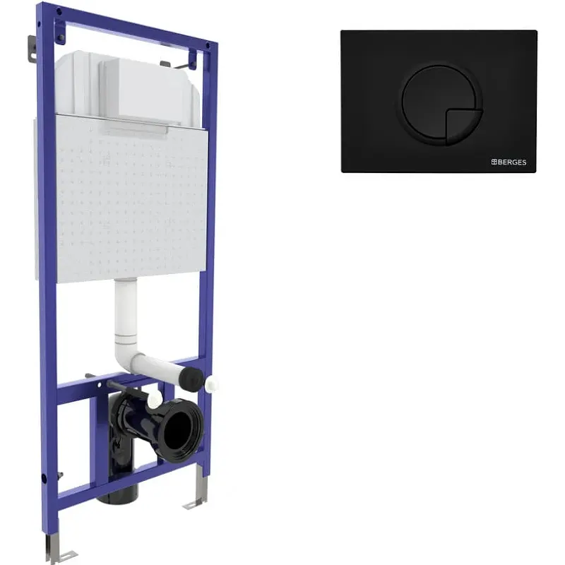 Инсталляция Berges Wasserhaus Novum 040225 для унитаза со смывным бачком и клавишей смыва Soft Touch.Характеристики: Инсталляция: Материал: латунь, пластик. Габариты (ШхВxГ): 52.5x139х17.5 см. Толщина бачка 80 мм. Антикоррозийное покрытие. Экономия воды. Метод установки сливного бачка: в стену (скрытый). Объем смыва 3/6 литра с возможностью регулировки. Резервуар воды объемом 10 литров с тепло-шумоизоляцией. При давлении 3-5 бар уровень шума от 13 до 18 дБ. Ножки регулировки высоты из оцинкованной стали. Расчетная нагрузка до 400 кг. Подвод воды сверху (G1/2 наружная). Регулируемая высота монтажной рамы: 115-139 см. Клавиша смыва R5 Soft Touch: Цвет: черный. Материал: ABS-пластик. Покрытие: Soft Touch. Габариты (ШхВxГ): 22.5x16.5х1.3 см. Двухрежимная клавиша смыва. Управление: механическое. В комплекте поставки: Инсталляция. Смывной бачок. Кнопка смыва. Полный комплект установки.