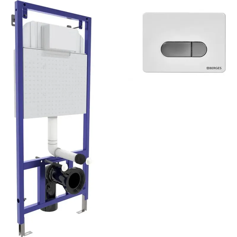 Инсталляция Berges Wasserhaus Novum 040237 для унитаза со смывным бачком и клавишей смыва.Характеристики: Инсталляция: Материал: латунь, пластик. Габариты (ШхВxГ): 52.5x139х17.5 см. Толщина бачка 80 мм. Антикоррозийное покрытие. Экономия воды. Метод установки сливного бачка: в стену (скрытый). Объем смыва 3/6 литра с возможностью регулировки. Резервуар воды объемом 10 литров с тепло-шумоизоляцией. При давлении 3-5 бар уровень шума от 13 до 18 дБ. Ножки регулировки высоты из оцинкованной стали. Расчетная нагрузка до 400 кг. Подвод воды сверху (G1/2 наружная). Регулируемая высота монтажной рамы: 115-139 см. Клавиша смыва D7: Цвет: белый, хром. Материал: ABS-пластик. Габариты (ШхВxГ): 22.7x16.5х1.3 см. Двухрежимная клавиша смыва. Управление: механическое. В комплекте поставки: Инсталляция. Смывной бачок. Кнопка смыва. Полный комплект установки.