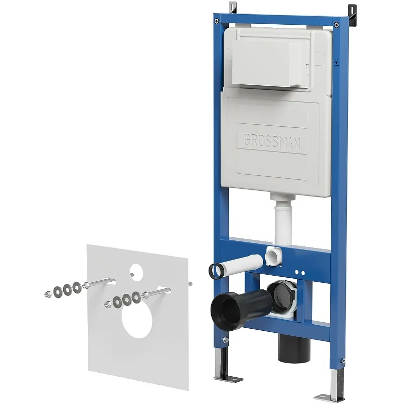 Инсталляция Grossman 900.K31.01.000 для унитаза.Характеристики: Цвет рамы: синий. Материал рамы: оцинкованная сталь с антикоррозийным покрытием. Материал бачка: пластик в кожухе из пенопласта. Габариты (ШхВхГ): 500х1340х190 мм. Монтажная высота: 1140-1340 мм. Монтажная глубина: 120 мм. Диаметр переходника для слива: 110 мм. Диаметр слива: 90 мм. Бесшовный бачок и патрубок, гарантируют 100-процентную герметичность. Управление: механическое. Двойной режим слива 3/6 л для снижения расхода воды. Регулируемая настройка (6-9 л / 3-4.5 л). Сливной бачок с защитой от конденсата. Шумопоглощение. Гидравлическое давление: 2-7 бар. Низкий уровень шума при наполнении воды. Подвод воды: сбоку бачка / сверху бачка. Бесступенчатая регулировка высоты ножек от 0 до 200 мм (позволяет установить унитаз на комфортной высоте). Межосевое расстояние для монтажа унитаза 180/230 мм. Максимальная нагрузка: до 400 кг. Установка: в капитальную стену и в пол. В комплекте поставки: Монтажная рама. Смывной бачок. Звукоизоляционная прокладка. Крепления к стене. Комплект присоединения к канализации. Паспорт изделия.