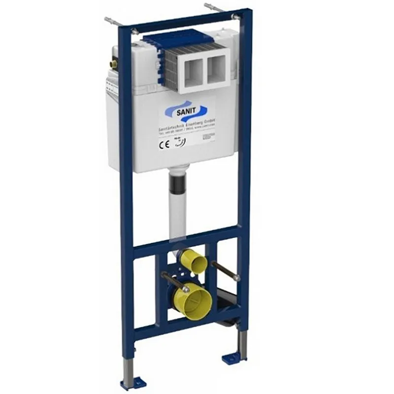 Инсталляция Sanit 90.506.00..S000 для унитаза.Характеристики: Цвет рамы: синий. Материал: металл, пластик. Управление: механическое. С малым ревизионным отверстием спереди. Монтажная ширина: 450 мм. Монтажная высота: 1120 мм. Монтажная глубина: 135 мм. Ножки регулируются по высоте: 0-200 мм. Бачок с защитой от конденсата, с двойным смывом (заводская настройка 6/3 л).