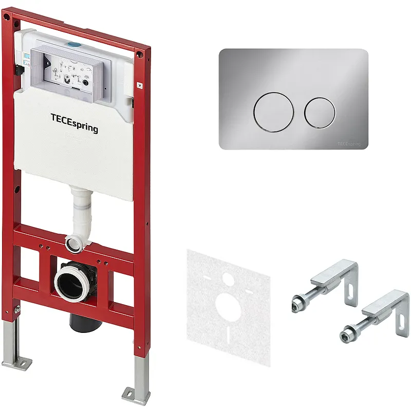 Инсталляция Tece Spring S955302 для унитаза.Характеристики:Инсталляция: Цвет: красный. Материал: сталь. Размеры (ШхВхГ): 506х1144х260 мм. Объем бачка 6 л. Настраиваемый объем малого смыва-от 2 до 5 л, большого-от 4 до 6 л. Монтаж заливного вентиля сверху или сзади бачка. Минимальная глубина установки 165 мм. Модуль выдерживает нагрузку более 400 кг. Универсальный модуль для всех типов подвесных унитазов. Расстояние между шпильками: 180/230 мм. Выдвижные опоры регулируемые: 0 - 200 мм. Несмотря на компактные размеры окна для установки панели смыва, бачок удобен в обслуживании. Клавиша смыва: Цвет: нержавеющая сталь. Материал: пластик. Размеры (ШхВхГ): 245х165х8 мм. Режим слива воды: две кнопки (режим эконом). Управление: механическое. В комплекте поставки: Застенный модуль. Клавиша смыва. Комплект крепежных элементов для установки модуля. Прокладка звукоизоляционная для унитаза. Фановый отвод для подключения к канализации DN110.