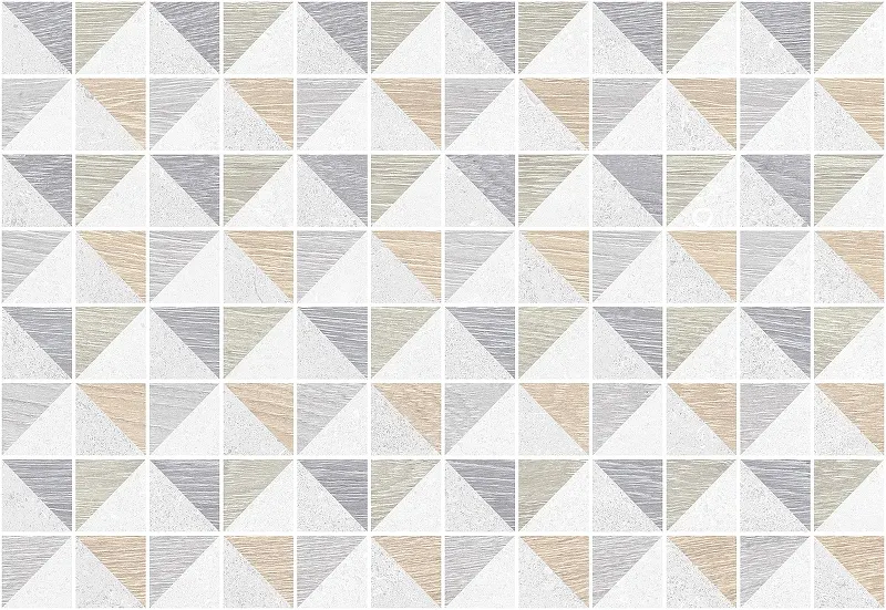 Керамическая плитка Керамин Киото 7Д треугольники настенная 27,5х40 см идеально подходит для облицовки стен в ванной и кухне. Мультиколорное покрытие с матовой поверхностью создаёт уникальный визуальный эффект, имитируя дерево, камень и мозаику.