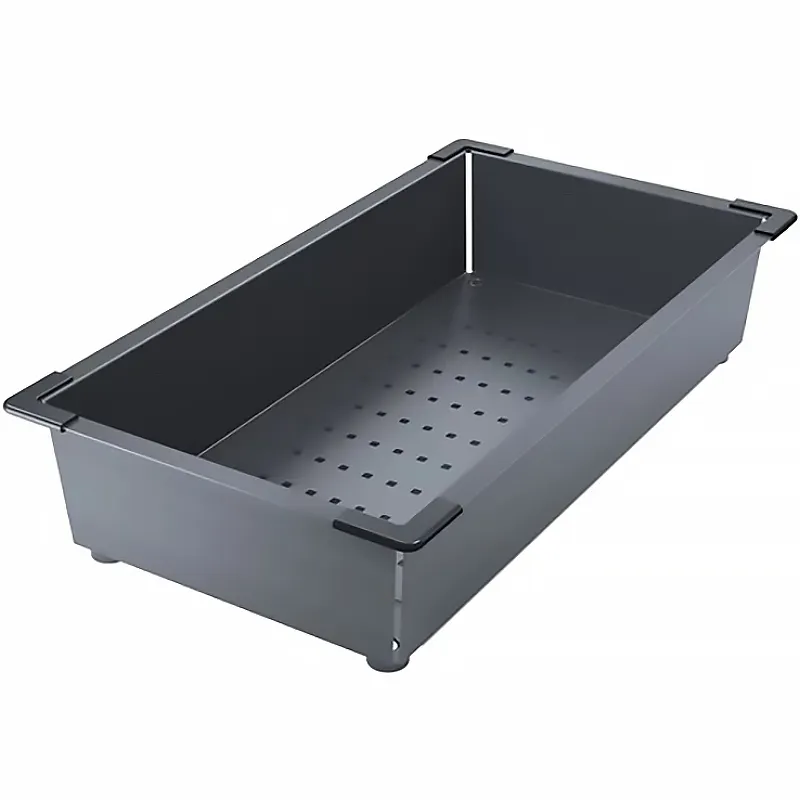 Коландер Iddis Kitchen Line KOL23GMi59.Характеристики: Цвет: графит. Материал: нержавеющая сталь SUS304. Покрытие: PVD. Размеры (ШхВхД): 428х90.5х233 мм. Ножки: ABS-пластик. Съемные защитные уголки. Отверстия на дне. Монтаж: на кухонную мойку. В комплекте поставки: Коландер.