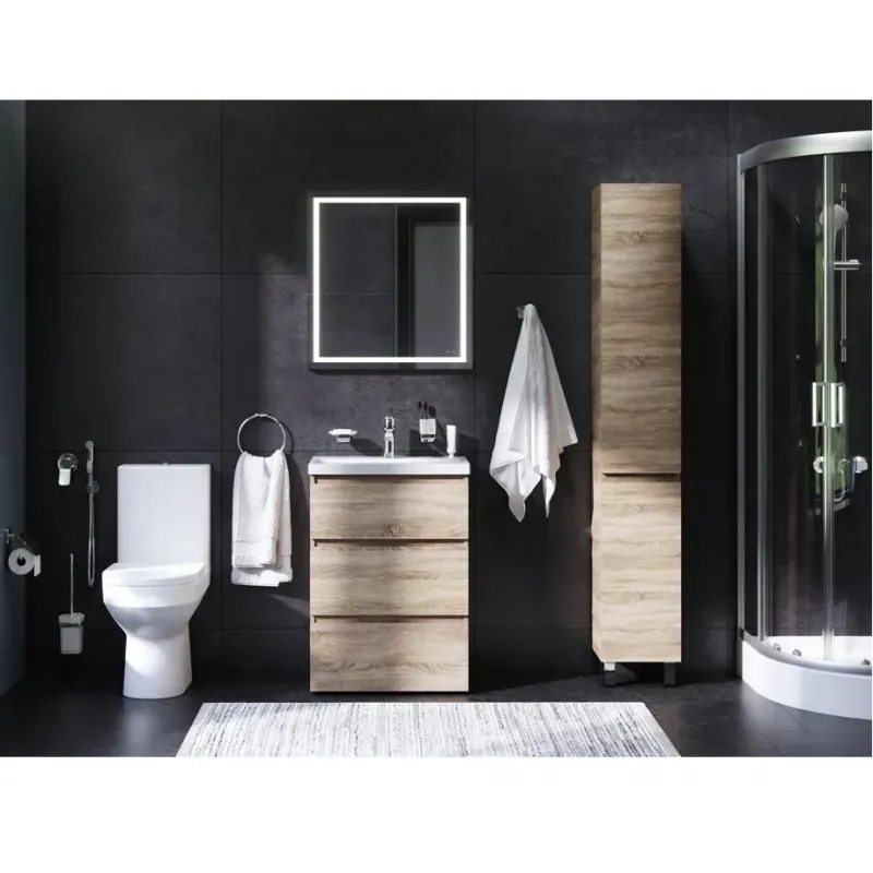 Комплект для ванной комнаты AM.PM Gem UK91SA.Характеристики: Душевой уголок: С раздвижными стеклянными дверцами для ванной комнаты любого дизайна. Система кронштейнов QuickFix позволяет с легкостью установить заграждение. Хромированные ролики двойной конструкции выдерживают до 150000 открытий и закрытий дверцы. Ширина входа - 52 см. Душевой поддон: Устойчив к воздействию влаги и образованию плесени. Диаметр слива - 52 см. Унитаз с сиденьем: Цвет: белый глянец. Материал: сантехнический фарфор. Тип монтажа: напольный. Конструкция чаши: типовая безободковая конструкция чаши построенная по технологии FlashClean дает 100 процентов защиты от разбрызгивания и гигиеничность. Материал сиденья микролифт: дюропласт. Цвет: белый. Гигиенический душ со смесителем: Изготовлен из ABS-пластика. Многослойное хромникелевое покрытие устойчиво к царапинам и потускнению, сохраняет первоначальный цвет и блеск на протяжении всего срока службы. Силиконовые форсунки с защитой от известкового налета. Фиксированный настенный держатель. Материал смесителя: латунь. Хромоникелевое покрытие. Керамический картридж AM.PM SoftMotion 35 мм обеспечивает тонкую настройку потока воды. Смеситель для раковины: Покрытие: глянцевый хром. Материал: экологически безопасная латунь. Управление: однорычажное. Механизм: керамический картридж Soft Motion, D 35 мм. Защита картриджа и аэратора от известковых отложений. Стандарт подключения: G 3/8. Смеситель для душа: Цвет: хром. Материал: латунь. Управление: однорычажное. Механизм: керамический картридж SoftMotion 35 мм. Тип подводки: 1/2. Монтаж: на стену. Душевой гарнитур: Покрытие: глянцевый хром. Функция Rub&Clean: легкая очистка душевых форсунок. Душевая штанга: H 70 см. Держатели душевой штанги: регулировка по высоте. Душевая лейка: дизайнерская, однорежимная, ABS пластик, D 11 см. Тип струй ручного душа: Spray. Держатель ручного душа: механическая фиксация с пол-оборота. Регулировка фирменного держателя лейки: в трех плоскостях. Гибкий шланг: функция защиты от перекручивания, L 175 см. Зеркало: Зеркальное полотно премиального качества производства Бельгии. Усиленная LED-подсветка по периметру обеспечивает отличное рассеянное освещение и отсутствие теней. Срок службы светодиодов составляет более 30 000 часов. Скрытый механический выключатель сохраняет эстетическую целостность дизайна зеркала, а также гарантирует отсутствие отпечатков пальцев на зеркальном полотне. Монтаж: подвесной, крепление к стене на двух навесах. Тумба под раковину: Компактное решение: узкая база с глубокими ящиками. Материал: высококачественный ДСП. Система Push to Open: ящики открываются нажатием на любую их часть. Система Soft-Close: доводчики для плавного закрывания. Монтаж: напольный. Дополнительные напольные опоры: две ножки. Раковина: Цвет: белый. Форма: прямоугольная. Размеры (ШхДхВ): 61x41,5x17 см. Материал: сантехнический фарфор. Одно готовое отверстие под смеситель по центру чаши. Отверстие для перелива воды. Монтаж: встраиваемый сверху на мебель. Двойной крючок для полотенец: Материал: цинк. Покрытие: хром. Стеклянная мыльница с настенным держателем: Материал мыльницы: стекло. Материал держателя: цинк. Цвет: белый, хром. Стеклянная мыльница с настенным держателем: Материал: стекло, цинк. Цвет: белый, хром. Держатель для туалетной бумаги с крышкой: Материал: цинк. Цвет: хром. Стойка с туалетной щеткой: Материал: цинк. Ц