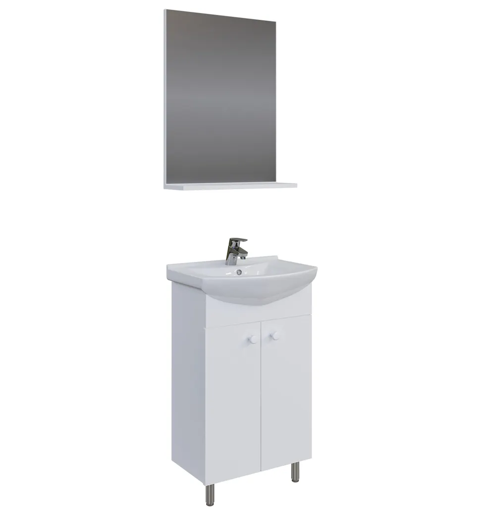 Комплект Grosmann Эко-60 - это идеальное сочетание минимализма, функциональности и цены. Компактные габариты позволяют грамотно организовать небольшой санузел, а строгий минималистичный дизайн гармонично впишется в интерьер любой ванной комнаты. Распашные двери с элегантными ручками скрывают вместительное пространство для хранения, разделенное полкой, зеркало укомплектовано полочкой, что позволяет разместить все необходимое. Тумба и зеркало с полочкой изготовлены из ЛДСП, устойчивой к механическим воздействиям, перепадам температур и высокой влажности. Две белые ручки и три ножки (2 декоративных хромированных и 1 пластиковая), раковина Грация-60 см идут в комплекте с тумбой.