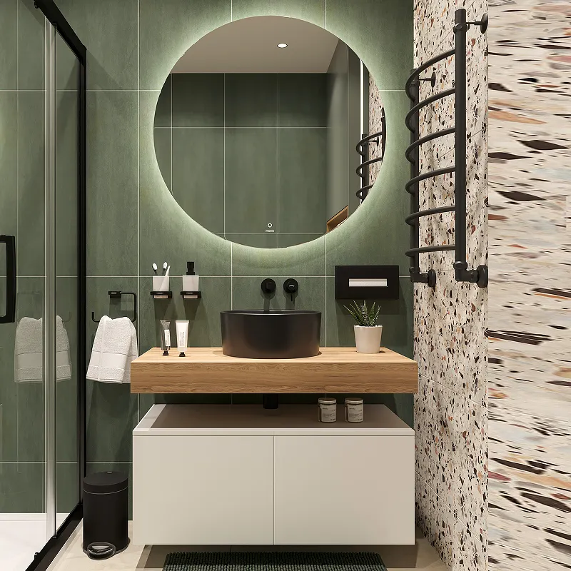 - Инновационное освещение: Зеркало с ореольной светодиодной подсветкой и сенсорным управлением.