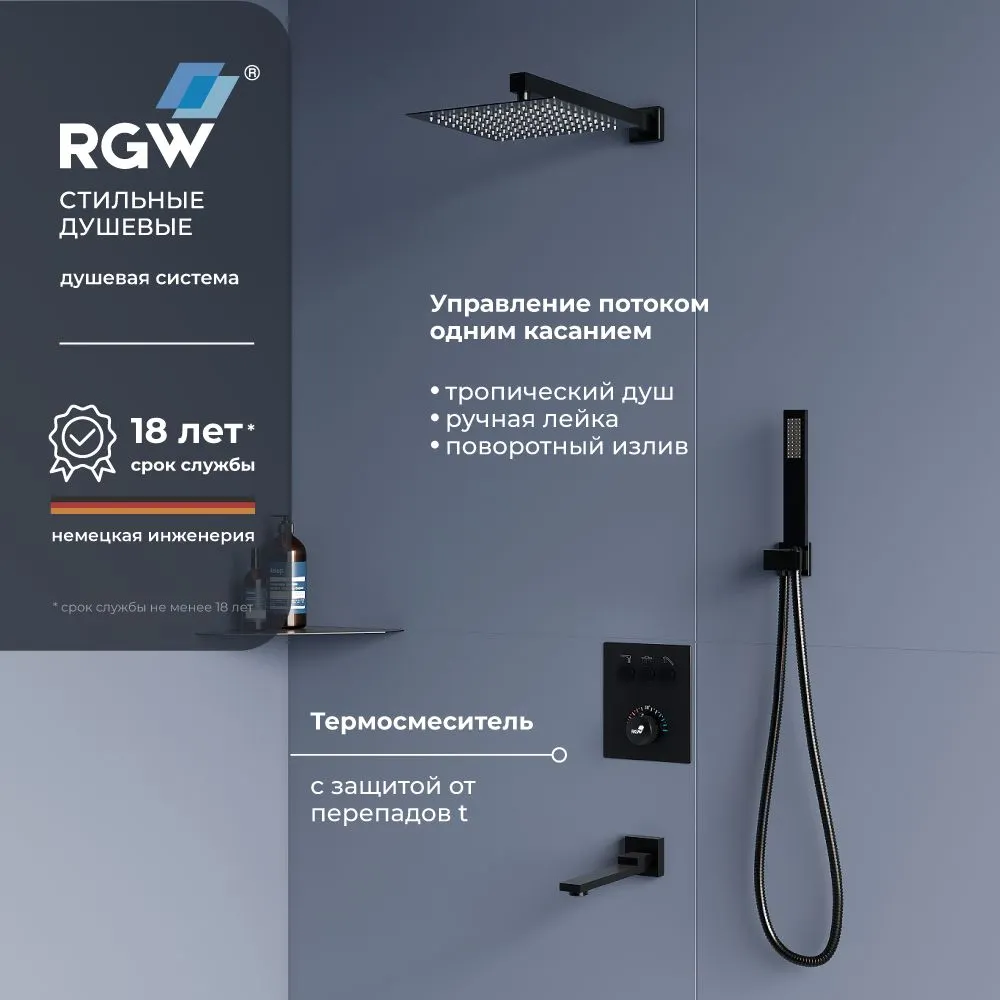 Преимущества Комплект RGW SP-371-B Черный (Головной душ/смеситель/ручной душ/излив)