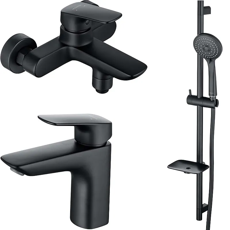 Комплект смесителей Aquatek Вега AQ1030MB Черный матовый — это идеальное решение для тех, кто ценит стиль и функциональность. Данный комплект включает смесители для раковины и ванны, а также душевой гарнитур, выполненные в современном дизайне. Благодаря однорычажному управлению и надёжному керамическому картриджу WANHAI, комплект обеспечивает удобство и долговечность использования. Материал: латунь и нержавеющая сталь, а покрытие — прочная эмаль, что гарантирует стойкость к коррозии и лёгкий уход.