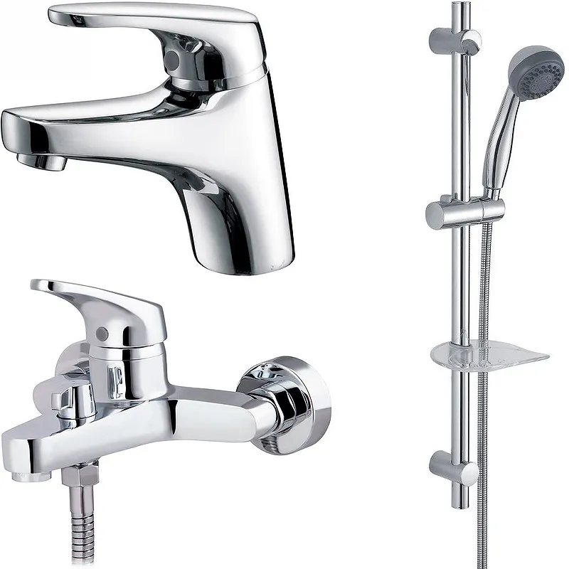 Комплект смесителей Kaiser County 5500К.Комплект включает в себя смеситель для раковины 55011, смеситель для ванны 55022, душевой гарнитур R-1100.Характеристики:Смеситель для раковины: Цвет: хром. Материал: латунь. Управление: однорычажное. Механизм: керамический картридж 40 мм. Излив: фиксированный. Аэратор. Стандарт подводки: 1/2. Тип подводки: гибкая. Отверстия для монтажа: 1. Монтаж: на раковину. Крепление: шпилька двойная. Смеситель для ванны: Цвет: хром. Материал: латунь. Управление: однорычажное. Механизм: керамический картридж 40 мм. Излив: фиксированный. Дивертор: автомат. Стандарт подключения: 1/2. Отверстия для монтажа: 2. Монтаж: на стену. Душевой гарнитур: Цвет: хром. Материал: металл. Форма ручного душа: круглая. Количество режимов струи ручного душа: 3. Держатель ручного душа регулируется по высоте имеет поворотный механизм с изменением угла наклона. Мыльница. Длина шланга: 1.5 м. Монтаж: на стену. В комплекте поставки: Смеситель для раковины. Смеситель для ванны. Душевая штанга. Ручной душ. Душевой шланг. Мыльница. Гибкая подводка. Комплект креплений.