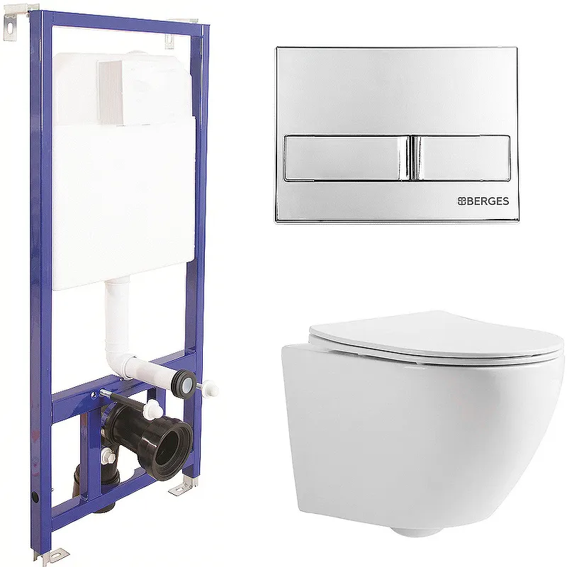 Комплект унитаза CeramaLux 2197 с инсталляцией Berges Novum L3 040213 со смывным бачком, с сиденьем Микролифт и клавишей смыва Хром.Характеристики:Унитаз: Цвет: белый. Материал: санфаянс. Размеры (ШхВхД): 370х360х490 мм. Направление выпуска: горизонтальное (в стену). Безободковая конструкция Rimless: отсутствие смывного края делает уход за унитазом проще. Организация смывающего потока: каскадный слив. Система антивсплеск. Антигрязевое покрытие. Подвод воды: сзади чаши. Монтаж: подвесной. Цвет фурнитуры: хром. Сиденье из дюропласта с плавным опусканием крышки (микролифт), быстросъемное. Инсталляция:Монтажная рама: Изготовлена из металла и покрыта антикоррозийной эмалью, защищающей от появления ржавчины. Смывной бачок толщиной всего 80 мм облегчает установку в небольших санузлах и ванных комнатах. Расчетная нагрузка: 400 кг. Межосевое расстояние: 18 и 23 см. Объем смывного бачка: 8,5 л. Возможность настройки слива в диапазоне от 4,5 до 8,5 литр