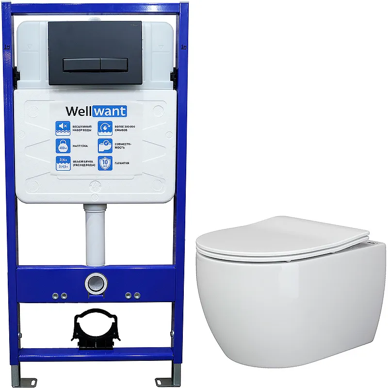 Комплект унитаза Ceramicanova Play CN3001 с инсталляцией WellWant Standart 50 WWISI111BB, с сиденьем Микролифт и Черной матовой клавишей смыва.Характеристики:Унитаз: Цвет: белый. Материал: санфаянс. Габариты (ШxВxГ): 370х340х490 мм. Направление выпуска: горизонтальное (в стену). Организация смывающего потока: воронка-водоворот. Безободковая конструкция. Система антивсплеск. Монтаж: подвесной. Сиденье из дюропласта с плавным опусканием крышки (микролифт), быстросъемное. Инсталляция: Цвет рамы: синий. Материал рамы: сталь 2 мм, покрыта антикоррозийным покрытием. Габариты (ШхВхГ): 50x113x10 см. Сливной бачок с защитой от конденсата. Межосевое расстояние под крепеж. шпильки: 18/23 см. Режим слива воды: с двумя режимами слива 4,5 - 6 л. Объем смывного бачка: 6 л. Диаметр слива: 9 см. Для капитальных стен. Инсталляция выдерживает вес до 400 кг. Максимальный уровень шума до 13 дБа. Клавиша смыва: Материал: пластик. Цвет: черный матовый. Фор