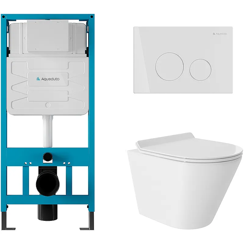 Комплект унитаза с инсталляцией Aqueduto Cone AQDS035T с сиденьем Микролифт и Белой глянцевой клавишей смыва.Характеристики:Унитаз: Цвет: белый глянцевый. Материал: фаянс. Габариты (ШхВхД): 360х320х480 мм. Антигрязевое покрытие. Антибактериальное покрытие. Устойчив к царапинам. Безободковая конструкция. Направление выпуска: горизонтальное (в стену). Организация смывающего потока: Торнадо. Система антивсплеск. Экономия воды. Монтаж: подвесной. Сиденье из дюропласта с плавным опусканием крышки (Микролифт), быстросъемное, ультратонкое. Инсталляция: Цвет: синий. Материал: сталь, ПЭВП. Габариты (ШхВхГ): 500х1112х260 мм. Объем смыва: 5/7.5 л, можно регулировать до 3/4.5 л и 4/6 л. Сливное колено регулируется вверх и вниз: 90-115 мм; спереди и сзади: 130-166 мм. Настенные кронштейны регулируемые 135-190 мм. Гибкие опорные ножки с цинковым покрытием, регулируемые в пределах 0-220 мм. Подвод воды: сверху или сзади. Защита от конденсата. Нагр