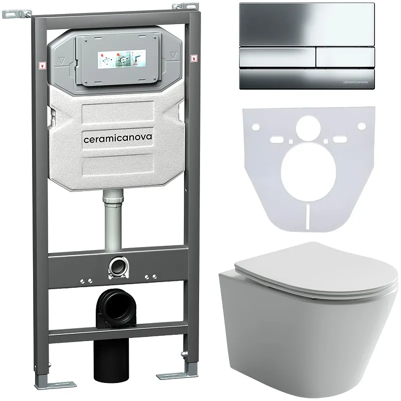 Комплект унитаза с инсталляцией Ceramicanova Balearica CN6000_1002CH_1000 с сиденьем Микролифт и клавишей смыва Хром глянцевый.Характеристики:Унитаз: Цвет: белый. Материал: санфарфор. Габариты (ШxВxД): 365х340х490 мм. Направление выпуска: горизонтальное (в стену). Организация смывающего потока: воронка-водоворот. Безободковая конструкция. Система антивсплеск. Защитный бортик от выплеска воды. Монтаж: подвесной. Сиденье из дюропласта с плавным опусканием крышки (микролифт), быстросъемное. Инсталляция: Цвет: серый. Материал: металл, пластик. Тип инсталляции: для подвесного унитаза. Размеры (ШхВхГ): 500х1140х260 мм. Межосевое расстояние под крепежные шпильки: 180-230 мм. Объем смыва: 3/6 л (4.5 л). Подвод воды: сверху бачка. Бачок герметизированный от попадания конденсата. Ножки с регулировкой: 0-200 мм. Монтажная глубина: 147 мм. Монтажная высота: 1140 мм. Диаметр слива: 90 мм. Диаметр переходника для слива: 110 мм. Метод крепления: в