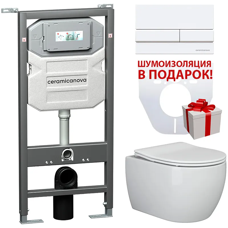Комплект унитаза с инсталляцией Ceramicanova Play CN3001_1002W_1000, с сиденьем Микролифт и Белой клавишей смыва.Унитаз Ceramicanova Play CN3001 неприхотлив в уходе. Выполнен из сантехнической керамики. Лаконичный дизайн идеально впишется в современный интерьер ванной комнаты. Специальное покрытие позволяет сохранять первоначальный вид на протяжении всего срока службы, не впитывает посторонние запахи. Верхняя часть унитаза устойчива к ударам.Характеристики:Унитаз: Цвет: белый. Материал: санфаянс. Габариты (ШxВxД): 370х340х490 мм. Направление выпуска: горизонтальное (в стену). Организация смывающего потока: воронка-водоворот. Безободковая конструкция. Система антивсплеск. Монтаж: подвесной. Сиденье из дюропласта с плавным опусканием крышки (микролифт), быстросъемное. Инсталляция: Цвет: серый. Материал: металл, пластик. Тип инсталляции: для подвесного унитаза. Размеры (ШхВхГ): 500х1140х260 мм. Межосевое расстояние под крепежные шпильки: 180-230