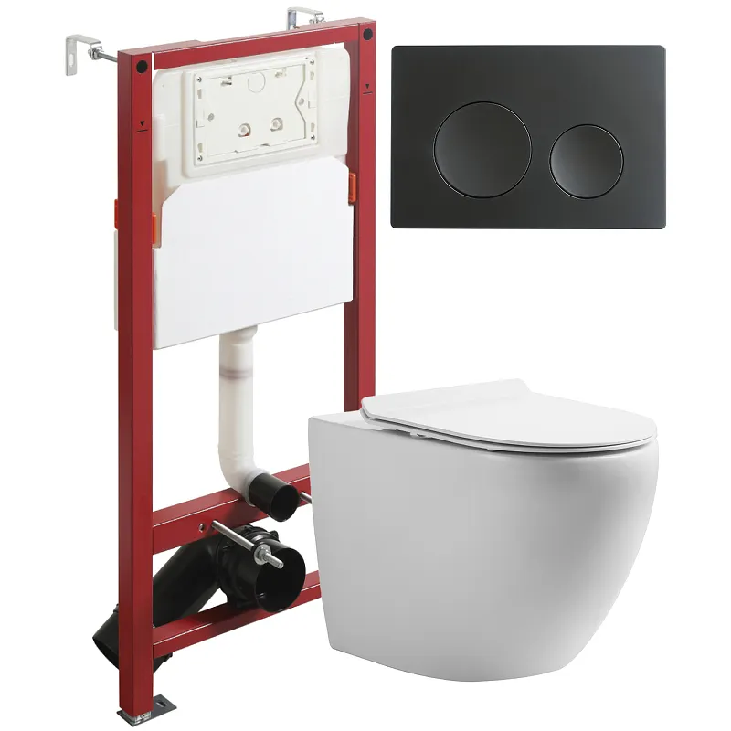 Комплект унитаза с инсталляцией Orange CI07-150W+APB144 — это премиальное решение для современного интерьера ванной комнаты. Подвесная конструкция с белым санфарфоровым унитазом и черной матовой клавишей смыва идеально подходит для установки с инсталляцией в капитальную стену и пол.