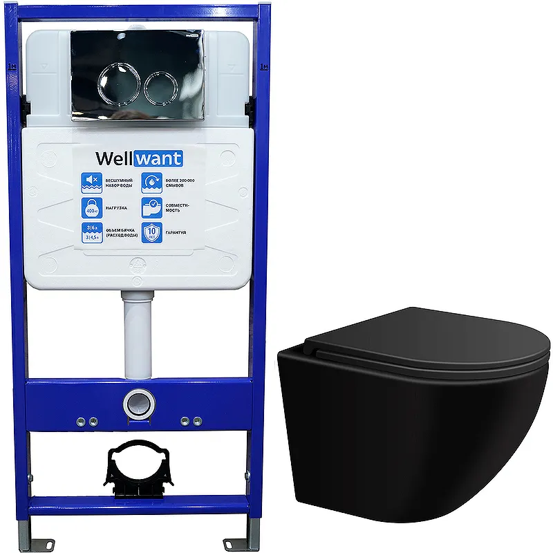 Комплект унитаза WellWant Aura WWU01122B с инсталляцией WellWant Standart 50 WWISI1110B с сиденьем Микролифт и клавишей смыва Хром глянцевый