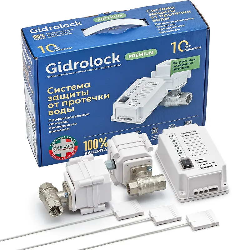 Комплект защиты от протечки воды Gidrоlock Premium Bugatti 1/2 31201021.Комплект Gidrоlock Premium Bugatti предназначен для обнаружения и локализации протечек воды в системах водоснабжения и отопления жилых, загородных домов, офисных зданий, магазинов, даже в момент отключения электроэнергии.Высококачественные итальянские шаровые краны Bugatti с электроприводом Gidrоlock автоматически перекроют подачу воды, получив команду от блока управления Premium, при попадании влаги на контакты проводного датчика WSP.При монтаже электропривод может быть отсоединен от шарового крана, что упрощает монтаж и позволяет установить шаровой кран с электроприводом в труднодоступных местах.Характеристики: Способ передачи сигнала: проводной. Система оповещения: звуковой сигнал. Выходная мощность: 0,8 кВт. Резервное питание: аккумулятор 12 Вольт 1,3А. Макс. количество установленных датчиков: 200 шт. Макс. количество подключаемых электроприводов: 6 шт. Максимальное давление ШЭП: до 40 Атм. Двигатели в приводе: бесколлекторные. Шаровой кран: Bugatti латунь (Италия). Диаметр подключения: 1/2 дюйма. Полное закрытие шарового электропривода до 15 секунд. Шаровые электроприводы не создают гидравлических ударов. Корпус электропривода защищенный герметичный IP65. Максимальная температура ШЭП: до +100 градусов. В комплекте поставки: Блок Управления Gidrоlock Premium (без АКБ) - 1 шт. Датчик протечки воды WSР (3м) - 3 шт. Аккумуляторная батарея 12 Вольт - 1 шт. ШЭП Gidrоlock Ultimate Bugatti 12V 1/2 - 2 шт.