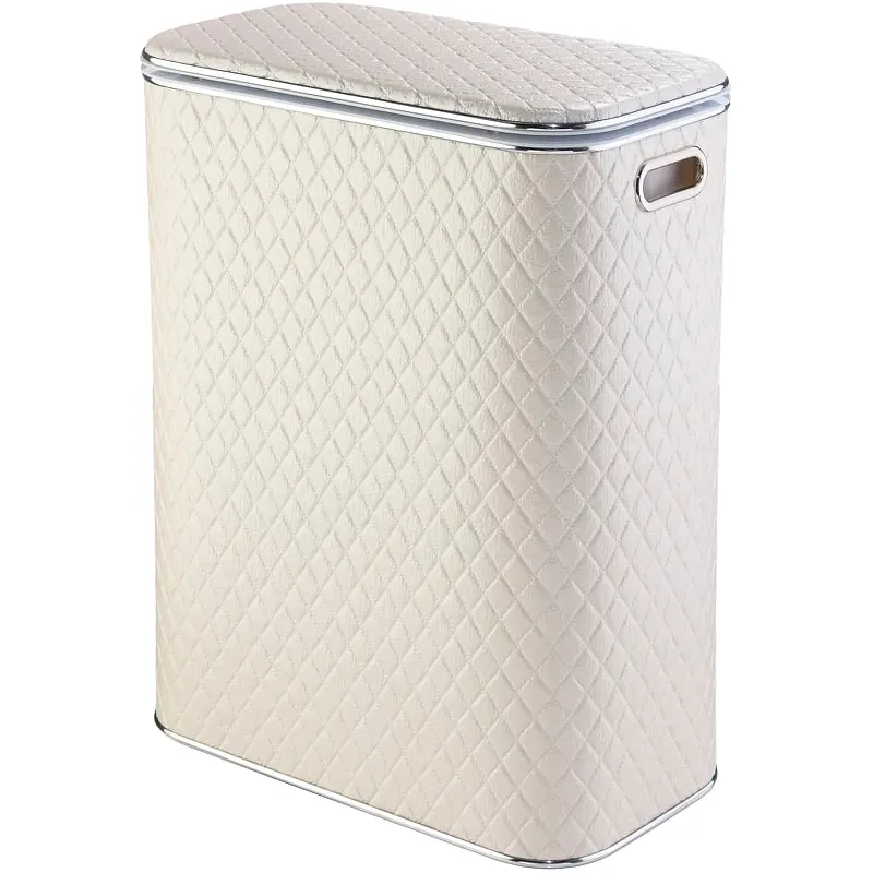 Корзина для белья Geralis CLH-B Ромб стандартная.Характеристики: Цвет: бежевый светлый. Кант: хром. Материал: экокожа, ABS-пластик. Габариты (ШхВхД): 450х600х250 мм. Объем: 67 л. Плавное закрывание крышки. Ручки для переноски. Выдерживает вес до 100 кг. Монтаж: напольный.
