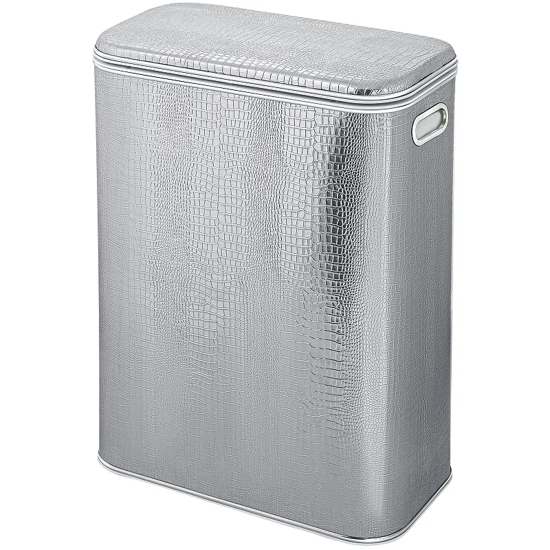 Корзина для белья Geralis KHH-B Croco стандартная.Характеристики: Цвет: серебро. Кант: хром. Материал: экокожа, ABS-пластик. Габариты (ШхВхД): 450х600х250 мм. Объем: 67 л. Плавное закрывание крышки. Ручки для переноски. Выдерживает вес до 100 кг. Монтаж: напольный.