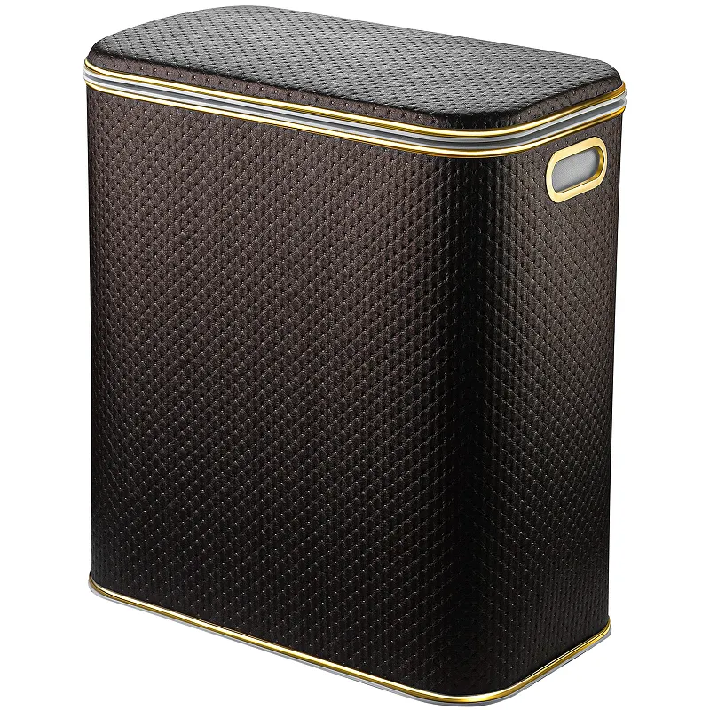 Корзина для белья Geralis PCG-M Punto в цвете шоколад с золотым кантом — идеальное решение для стильного и функционального хранения белья. Эта напольная корзина для белья из экокожи и ABS-пластика не только украсит ваш интерьер, но и обеспечит удобство в использовании благодаря плавному закрыванию крышки и практичным ручкам.