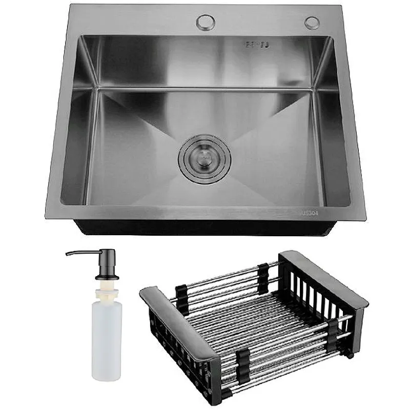 Кухонная мойка Ростовская Мануфактура Сантехники 58 MR-5843BL c корзиной и дозатором.Характеристики: Цвет: графит. Материал: нержавеющая сталь. Размеры (ШхВхГ): 580х200х430 мм. Размеры чаши (ШхГ): 530х330 мм. Диаметр слива: 11 см. Форма: прямоугольная. Отверстия под смеситель: 1. Тип установки: встраиваемый сверху. В комплекте поставки: Кухонная мойка. Дозатор. Корзина раздвижная. Сифон.