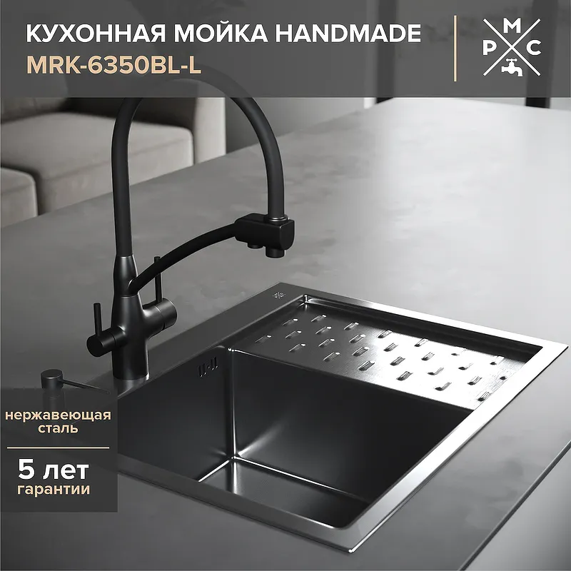 Кухонная мойка Ростовская Мануфактура Сантехники 63 MRK-6350BL-L.Характеристики: Цвет: темный графит. Материал: нержавеющая сталь. Толщина металла: 1-3 мм. Размеры (ШхВхГ): 629х180х500 мм. Размеры чаши (ШхГ): 360х400 мм. Диаметр слива: 11 см. Форма: прямоугольная. Отверстия под смеситель: 1.Расположение чаши: слева. Расположение крыла: справа. Тип установки: врезная, встраиваемая сверху. В комплекте поставки: Кухонная мойка. Дозатор для моющего средства. Евросифон. Комплект крепления.