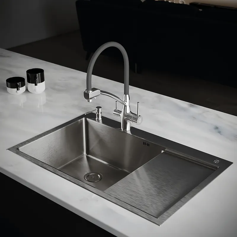 Кухонная мойка Ростовская Мануфактура Сантехники 78 MRK-7851L.Характеристики: Цвет: нержавеющая сталь. Материал: нержавеющая сталь. Толщина металла: 1-3 мм. Размеры (ШхВхГ): 779х180х509 мм. Размеры чаши (ШхГ): 432х410 мм. Диаметр слива: 11 см. Форма: прямоугольная. Отверстия под смеситель: 1.Расположение чаши: слева. Расположение крыла: справа. Тип установки: врезная, встраиваемая сверху. В комплекте поставки: Кухонная мойка. Дозатор для моющего средства. Евросифон. Комплект крепления.