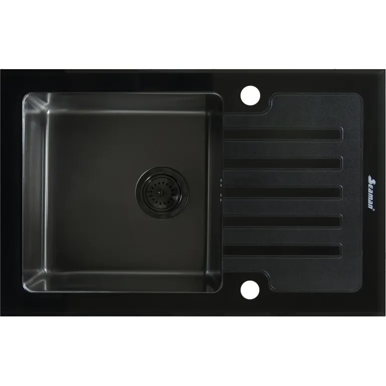 - Кухонная мойка с закалённым стеклом: Верхняя панель выполнена из прочного закалённого стекла толщиной 8 мм, что придаёт изысканность и долговечность.