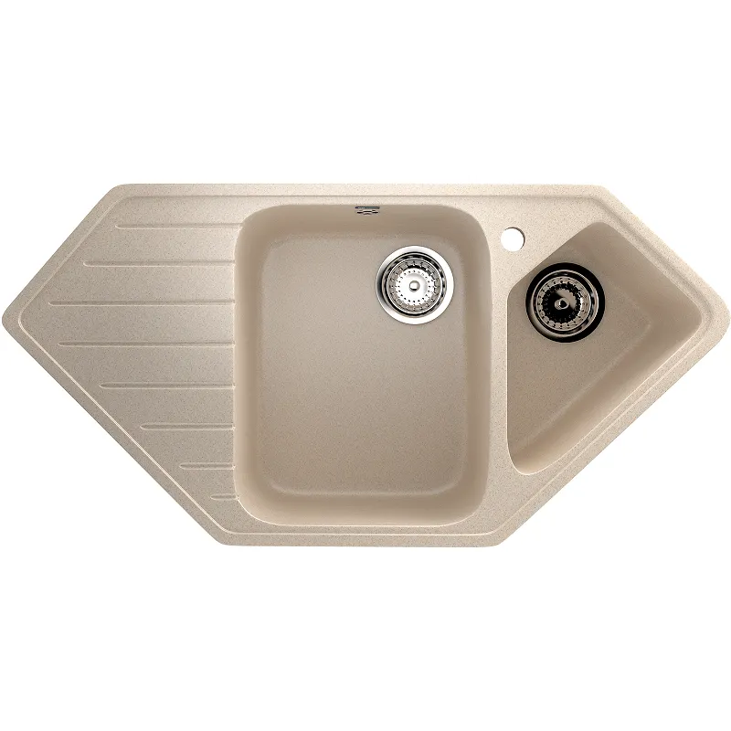 Угловая двухсекционная кухонная мойка Ulgran Classic U-409-328.Большая угловая мойка с боковым крылом и объемной дополнительной чашей. Модель имеет строгую современную геометрию. Функциональное сочетание большого бокового крыла и коландера, что позволит Вам одновременно мыть посуду, размораживать мясо, а также сушить посуду или фрукты с овощами, например.Характеристики: Цвет: бежевый. Материал: искусственный камень на основе натурального мрамора (80%) и полимерных связующих (20%). Защитное покрытие гелькоут: не имеет микропор, не впитывает загрязнения, устойчив к ультрафиолету, обладает антибактериальными свойствами. Поверхность: матовая. Толщина материала: 15 мм. Размер мойки (ШхД): 970х500 мм. Размер основной чаши (ШхДхГ): 350х435х200 мм. Размер дополнительной чаши (ШхДхГ): 250х335х175 мм. Размер установочного проема: 945х475 мм. Диаметр слива: 9 см. Отверстия под смеситель: 1. Расположение крыла: слева. Перелив. Монтаж: врезной (встраиваемая сверху). В комплекте поставки: Мойка. Сливная арматура, гофро-труба. Корзинчатый вентиль. Сифон.