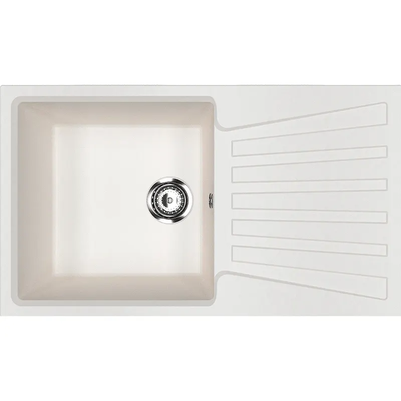 Кухонная мойка Ulgran Classic U-703-341.Характеристики: Цвет: ультра-белый. Материал: искусственный камень на основе натурального мрамора (80%) и полимерных связующих (20%). Защитное покрытие гелькоут. Поверхность: матовая. Толщина материала: 15 мм. Размер мойки (ШхВхД): 830х210х480 мм. Размер чаши (ШхВхД): 410х190х415 мм. Размер установочного проема (ШхД): 805х455 мм. Диаметр слива: 90 мм. Намеченных отверстий под смеситель: 2. Перелив. Расположение крыла: оборачиваемая. Форма: прямоугольная. Монтаж: врезной (встраиваемая сверху). В комплекте поставки: Мойка. Сливная арматура с гофротрубой. Технический паспорт / гарантийный талон.