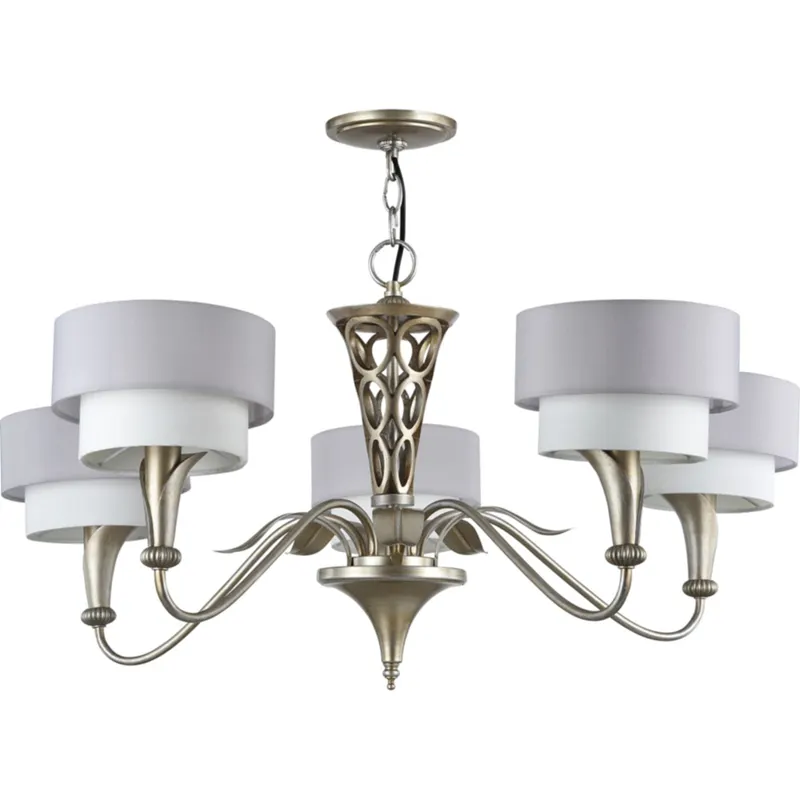 - Классическая люстра для гостиной: сочетание изысканных материалов — металл и хлопок на ПВХ.