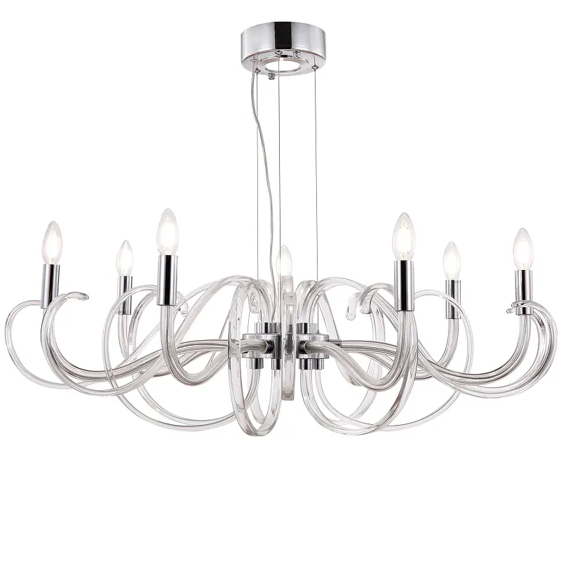 • Элегантный дизайн с прозрачным и хромированным покрытием: Прозрачные и хромированные элементы придают люстре стильный и современный вид.