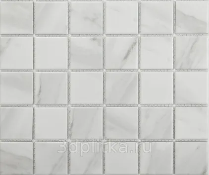 - Керамическая мозаика для ванной комнаты: Матовая поверхность и рисунок под мрамор создают элегантный стиль и устойчивы к воздействию влаги.