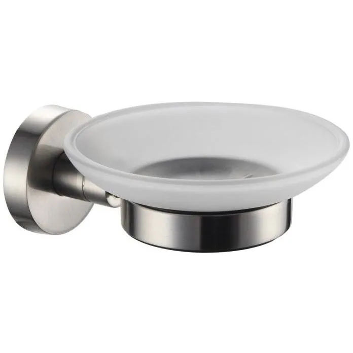 Аксессуар с латунным держателем с покрытием: сатин. Круглая чаша мыльницы изготовлена из матового белого стекла. Мыльница настенная проста в установке и в уходе. Размеры: 13,3x10,6x5,2 см. Упаковка: блистер.