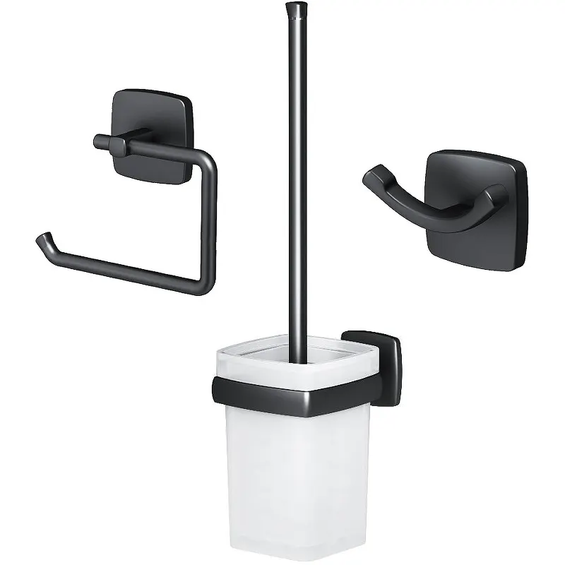 - Полный комплект: Включает все необходимые элементы, такие как держатель туалетной бумаги, ершик и двойной крючок.