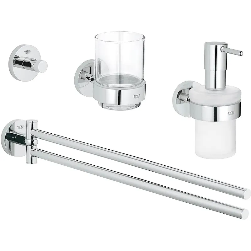 Набор аксессуаров для ванной Grohe Essentials 40846001 из четырех предметов.Характеристики: Материал: металл, стекло. Цвет: хром. Монтаж: на стену. В комплекте поставки: Дозатор для жидкого мыла (40448001). Стакан для зубных щеток (40447001). Полотенцедержатель (40371001). Крючок (40364001). Крепления.