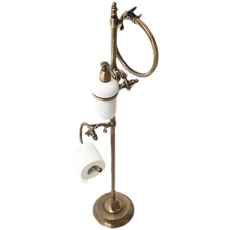 Напольная стойка Art&Max Barocco AM-2164-Br.Характеристики: Цвет: бронза. Материал: латунь. Размер (ШхВхД): 160х570х150 мм. Оснащение: кольцо для полотенец, держатель туалетной бумаги, дозатор для жидкого мыла. Монтаж: напольный. В комплекте поставки: Напольная стойка.