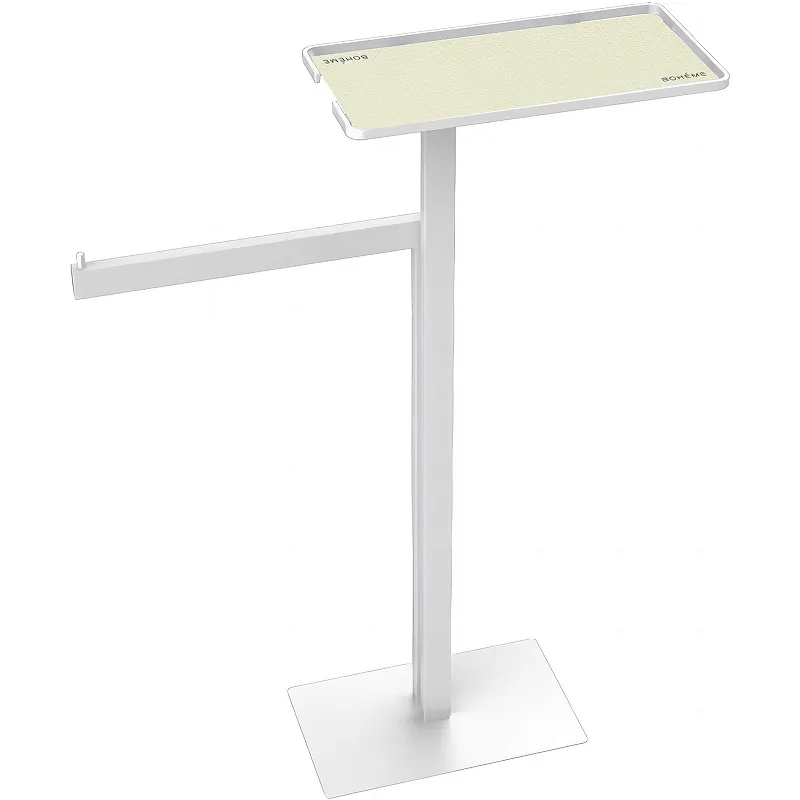 Напольная стойка Boheme 10952-MW.Характеристики: Цвет: белый матовый. Материал: нержавеющая сталь, экокожа. Размеры (ШхВхД): 575х650х150 мм. Оснащение: полотенцедержатель, вращающаяся полка с отделкой из экокожи. Монтаж: напольный. В комплекте поставки: Напольная стойка.